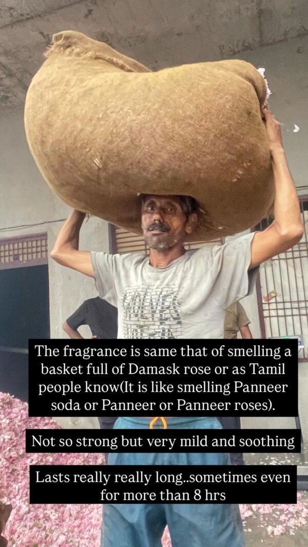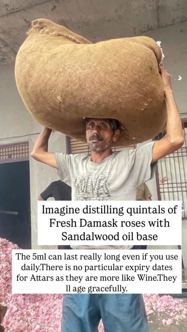 It is a product with Geographical Indication Tga(GI Tag) from the Perfume capital Of India,KANNAUJ.Imagine distilling quintals of Fresh Damask roses with Sandalwood oil base
